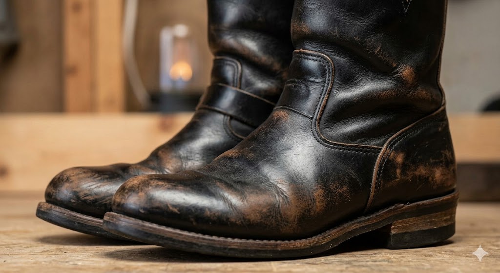 - 最大の魅力「茶芯(ちゃしん)」:当時の黒い革は、茶色のレザーの表面だけを黒く塗っていました。そのため、履き込むと表面が削れ、中から茶色い芯が覗いてくる独特のヴィンテージ感が出ます。これがファンの間で「渋い」と熱狂的に支持されています。